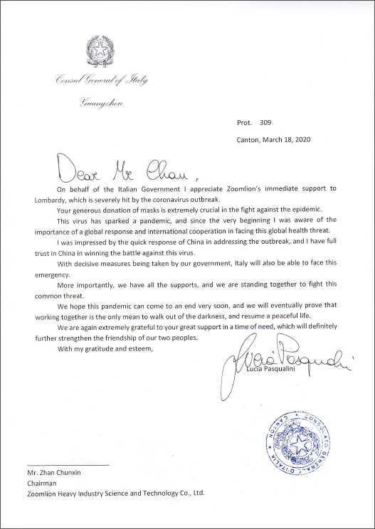 意大利驻广州总领事白露茜女士在信函中写道:“我代表意大利政府感谢中联重科对伦巴**的及时支持,该大区在新型冠状病毒疫情爆发中受到严重冲击。你们慷慨捐赠的口罩在与该疫情作斗争中至关重要。……再次非常感谢你们在我们有需要的时候给予的大力支持,这必将进一步增进我们两国人民的友谊。”