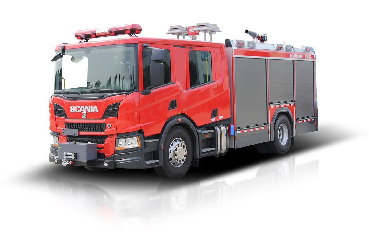 PM55城市主战消防车采用原装进口斯堪尼亚P410改装, 底盘作为车辆主要组成部分,除了行驶时承载以外,还是上装部分的载体,同时为灭火系统正常工作,可靠、平稳地传递动力。容罐作为车辆的基础件,用于装载水及泡沫灭火剂。灭火系统由消防泵、泡沫混合系统、消防炮及管路、阀门等组成。为适应消防灭火实战需要,该车既可以使用车顶消防炮灭火,也可以使用水带连接直流、开花水枪或泡沫枪进行灭火;同时可以利用车上携带发电照明系统对救援现场提供电力保障和照明;车辆还随车携带了大量抢险救援器材用于抢险救援工作。